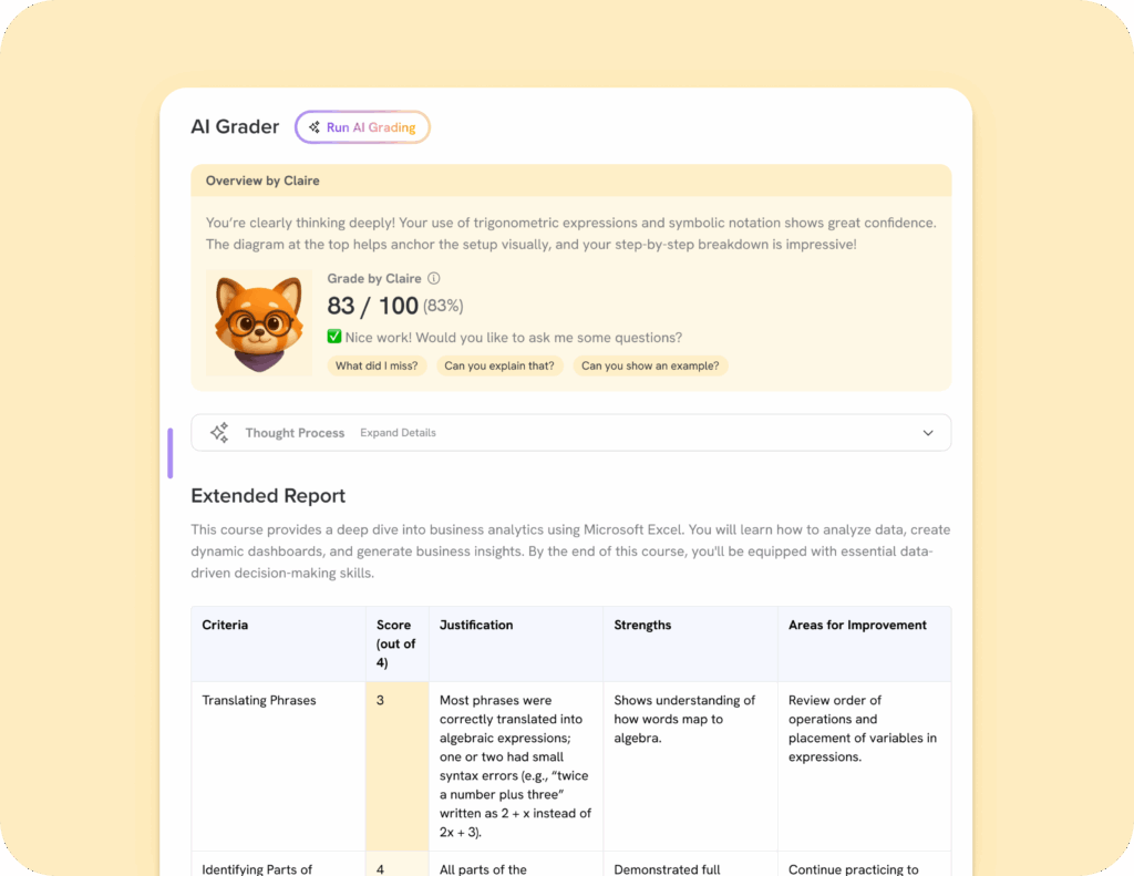 Our AI for grading ensures every assignment is evaluated against the same standards and rubrics. This consistency eliminates subjectivity, aligns grading with learning objectives, and provides fair, objective scores for all students across different classes and assessments.
