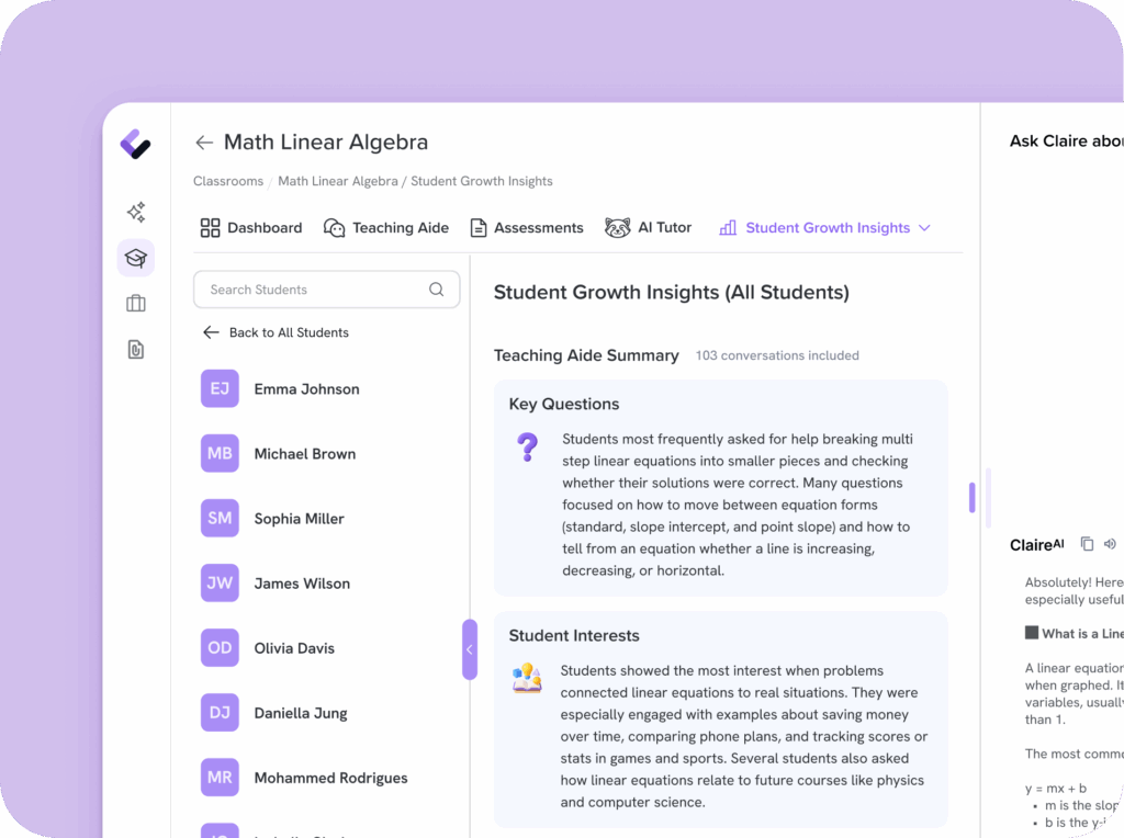 Beyond scores, our AI for grading delivers rich insights and analytics on student performance. Teachers can identify learning gaps and trends through automatically generated reports, helping them tailor follow-up instruction. By turning grading data into actionable insights, Colleague AI supports data-driven teaching adjustments.