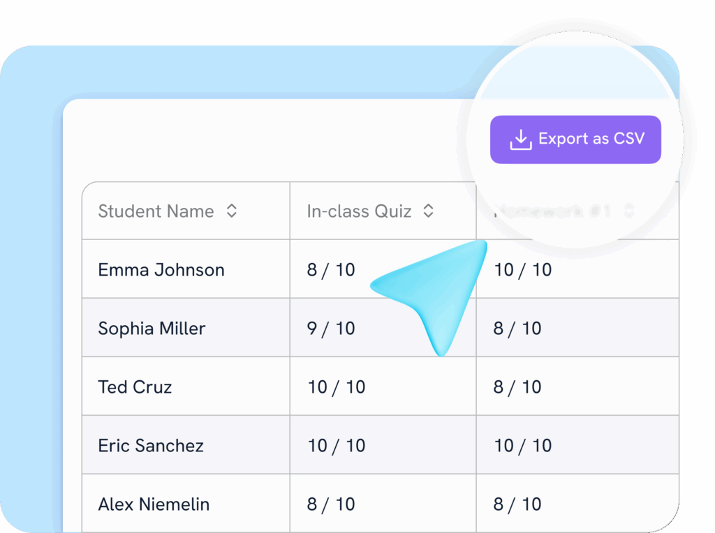 After running our AI to grade and submit grades, sync with your Learning Management System (LMS) or Student Information Systems (SIS) automatically for enterprise users, or simply export as a CSV with one click.