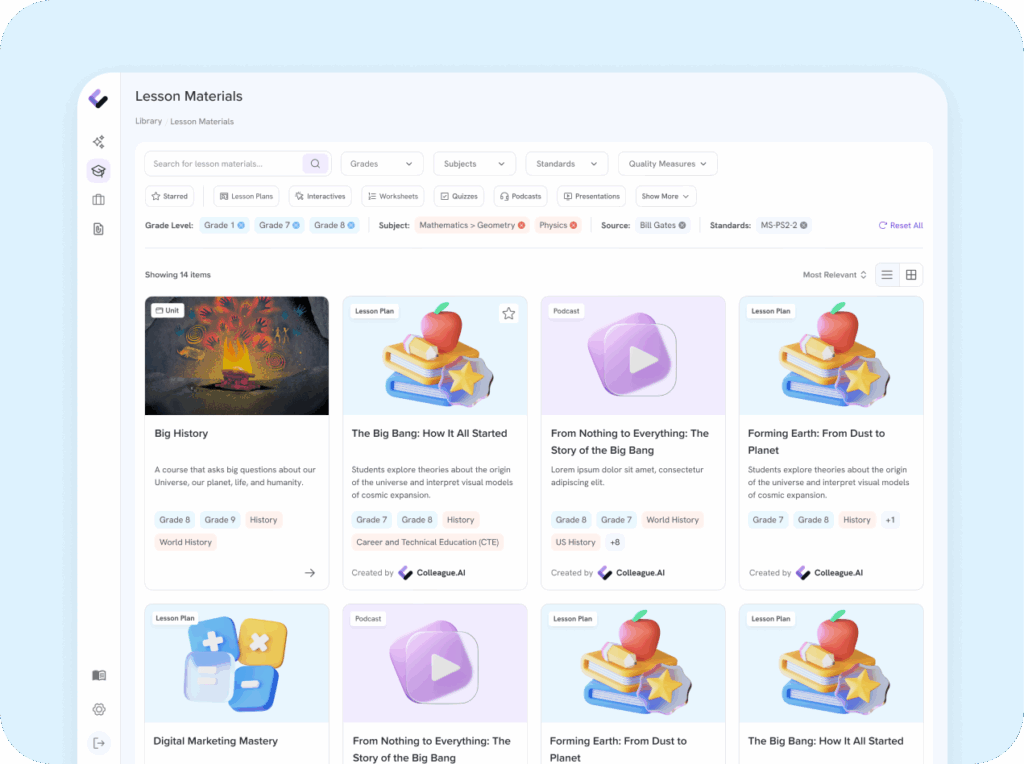As organizational leaders, Colleague AI enables you to align your educators’ AI usage to the standards and curriculum by providing these to your Colleague AI instance. Educators can then use these in the platform to create lesson plans, content, activities, and more, meaning you can have confidence that material is what it should be.