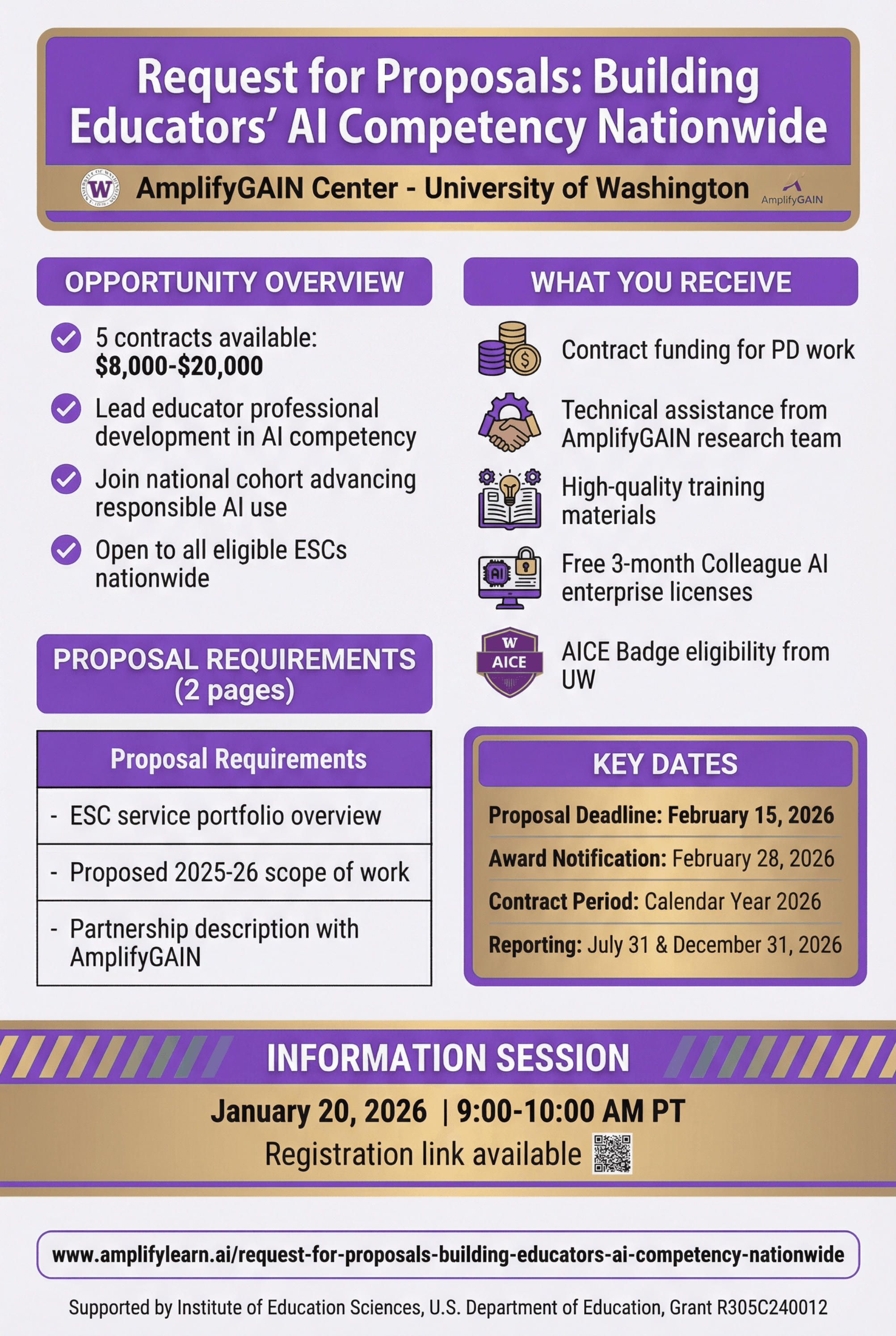 AmplifyGAIN will award five contracts ranging from $8,000 - $20,000 , based on scope and anticipated impact. Selected ESCs will join a national cohort focused on advancing responsible, classroom-ready AI use and contributing to a growing peer learning network.