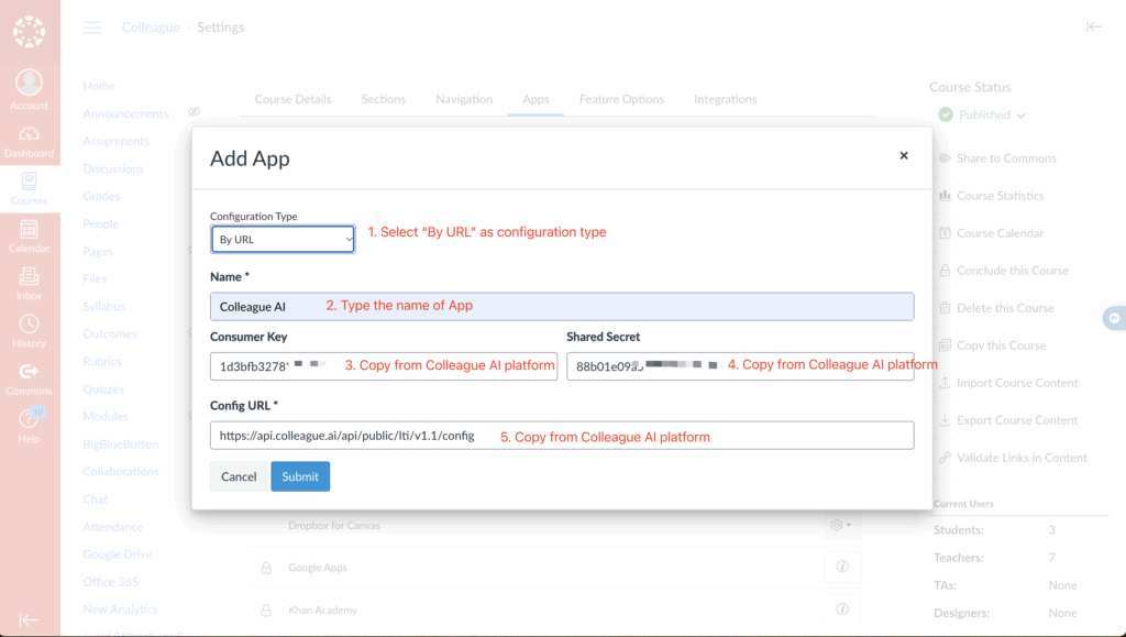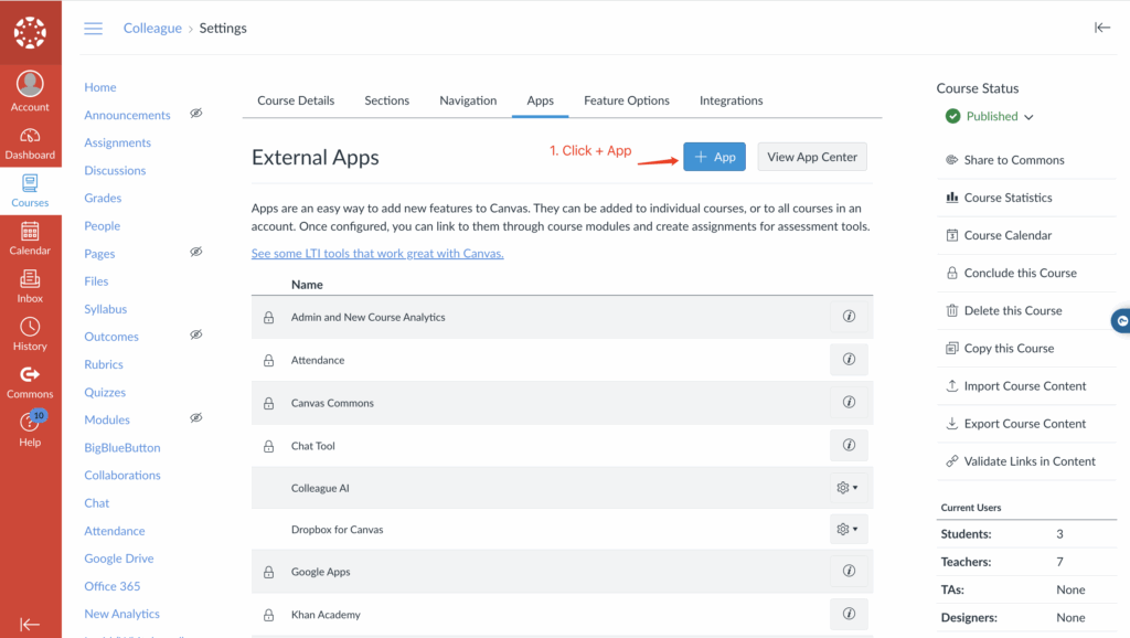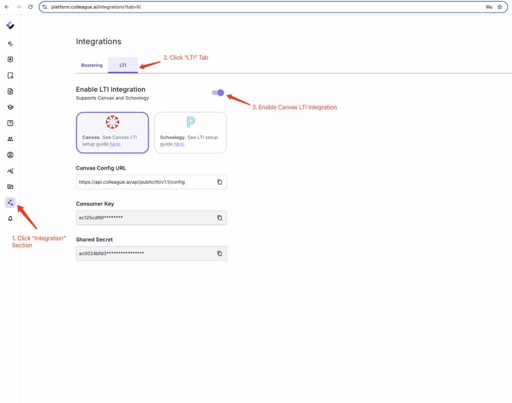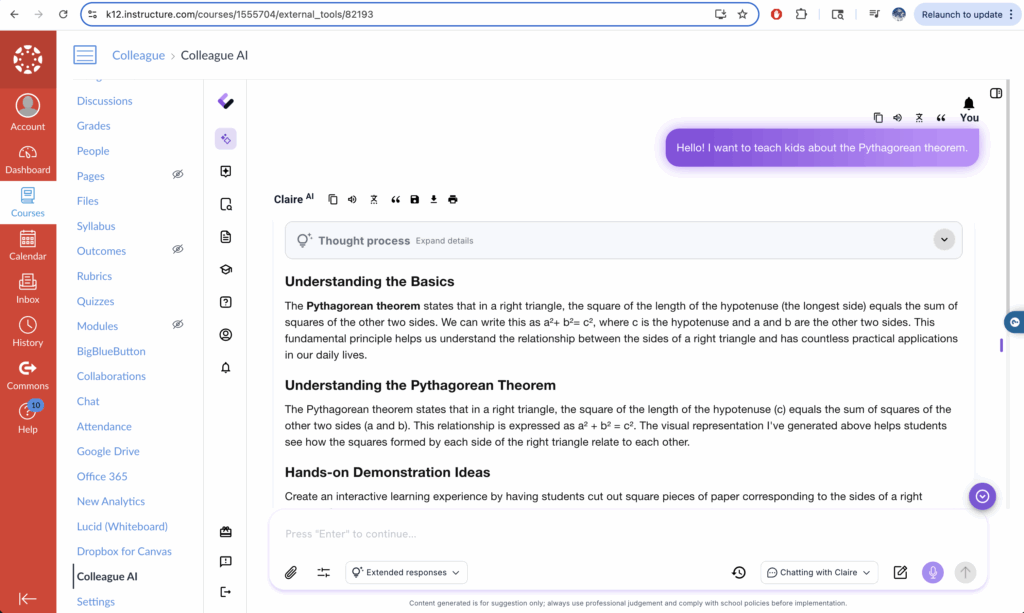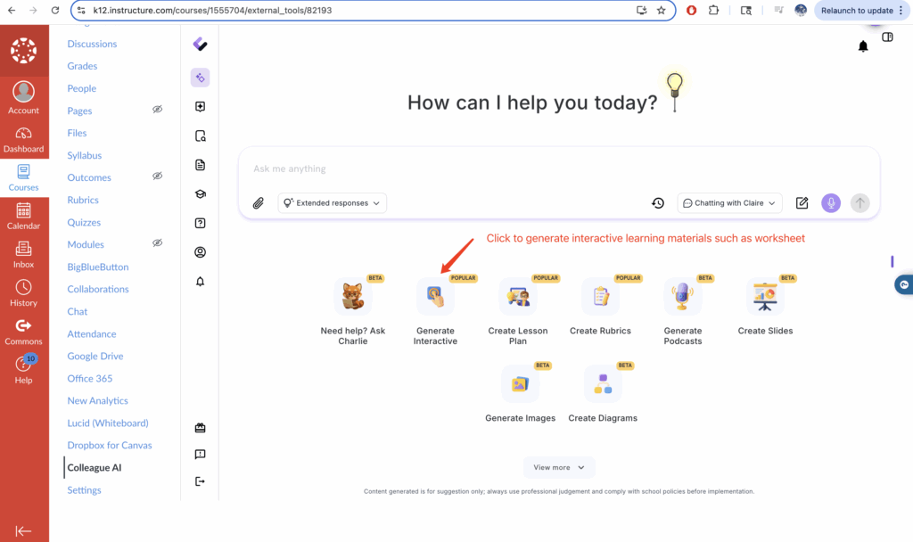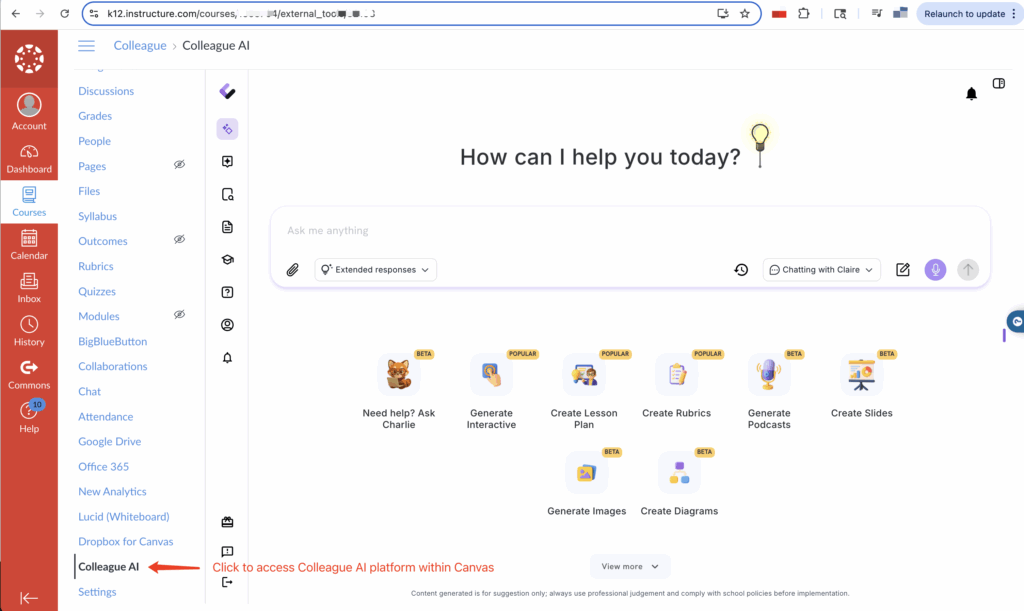 Users can access Colleague AI platform within Canvas after successful installation of the LTI integration.