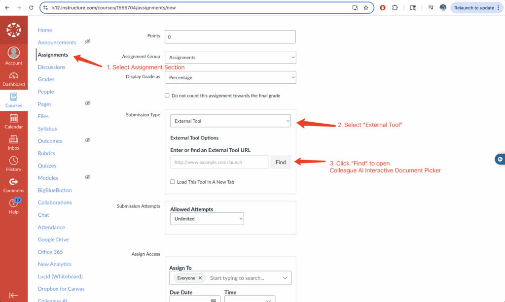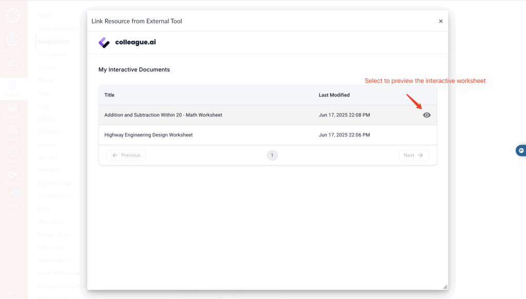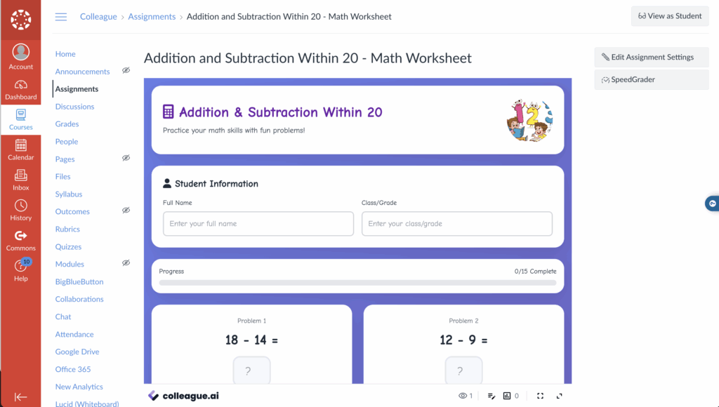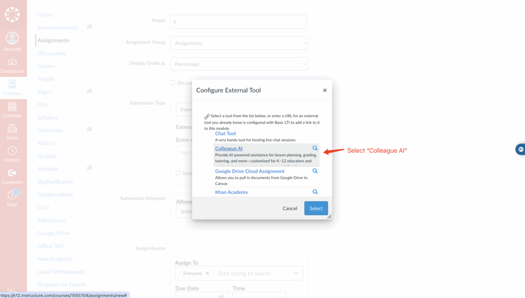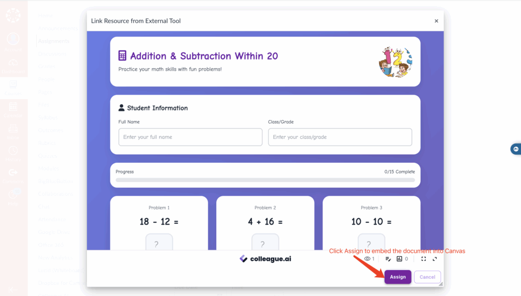 Users can create Canvas assignments by embedding interactive learning materials from Colleague AI.