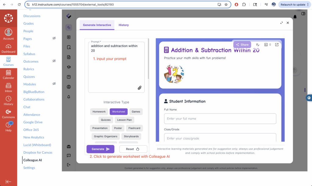 Users can easily generate highly engaging learning materials such worksheets with help of Colleague AI
