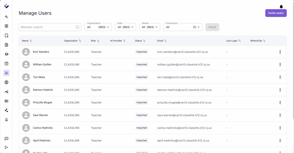 5. Open “Manage members” page to check all imported organization users (Teachers, Students and Staffs). https://platform.colleague.ai/members