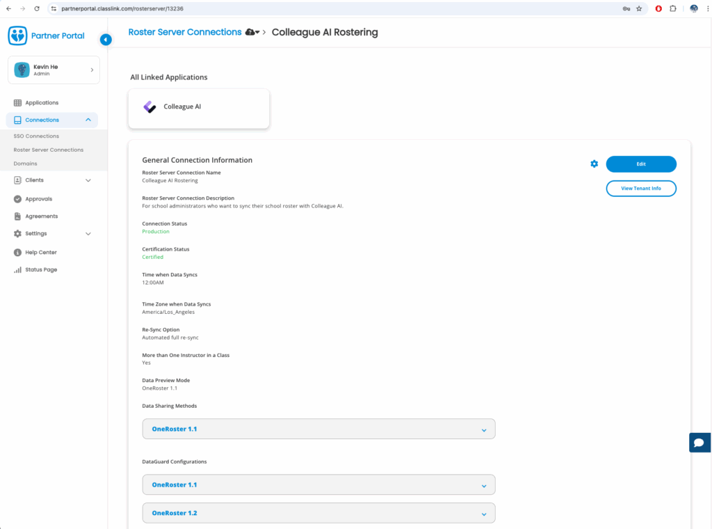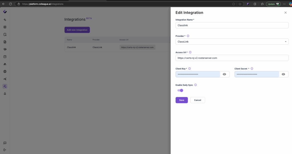 2. Open Colleague AI “integration” page: https://platform.colleague.ai/integrations?tab=rostering and create a new integration. Input Client key and client secret from Classlink portal.