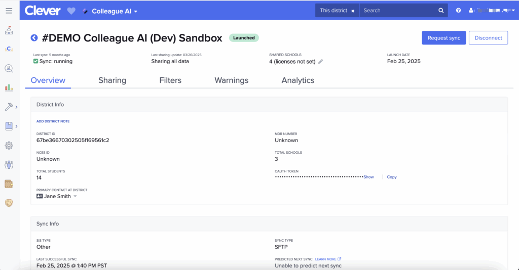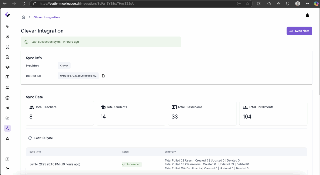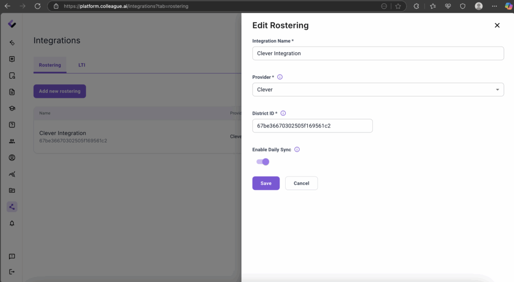 2. Open Colleague AI “integration” page: https://platform.colleague.ai/integrations?tab=rostering and create a new integration. Input District ID from Clever portal.