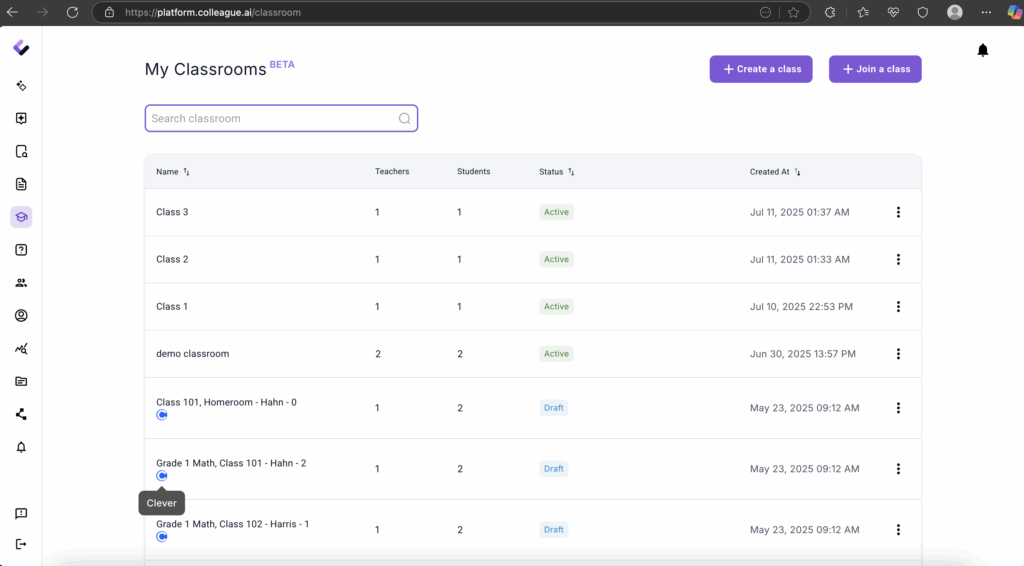 4. Open “Classroom” page to check all imported classroom enrollment. https://platform.colleague.ai/classroom