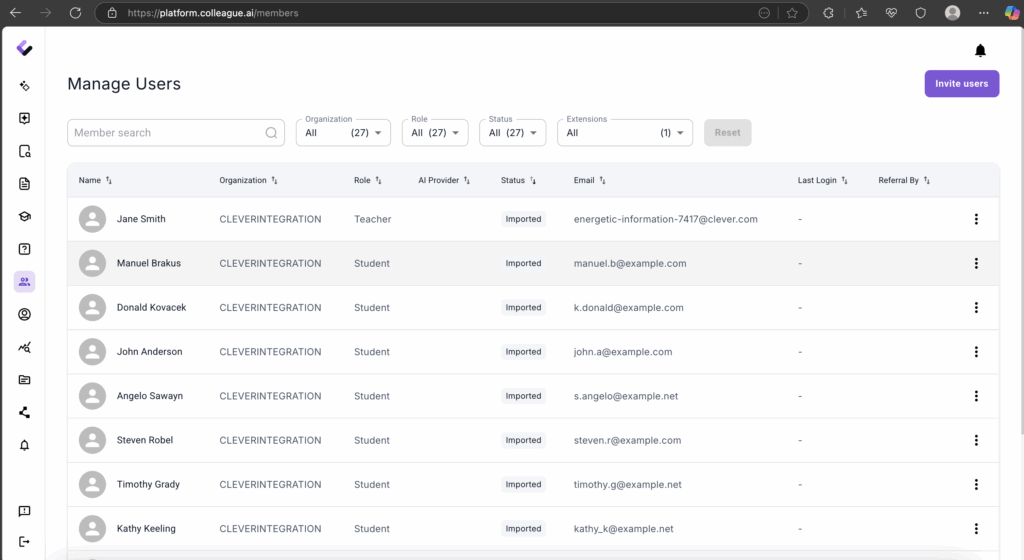 5. Open “Manage members” page to check all imported organization users (Teachers, Students and Staffs). https://platform.colleague.ai/members