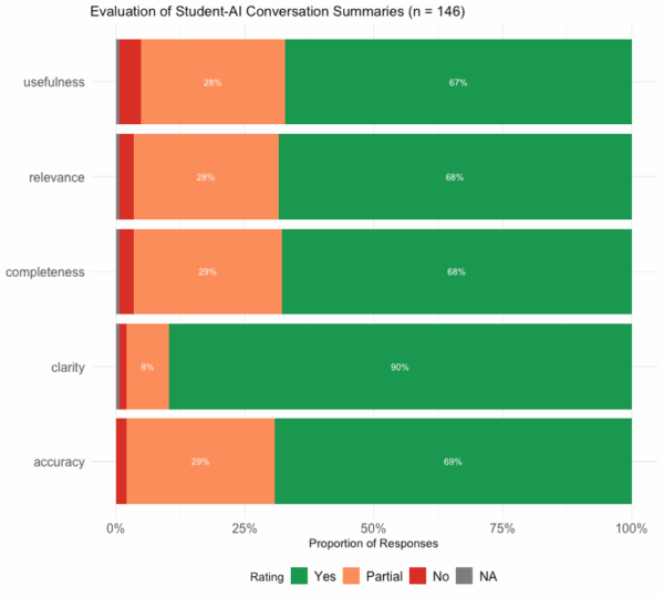 The results were positive! Over 140 student-AI conversation summaries were reviewed and the majority were found to be accurate, relevant, complete, clear, and useful. Half of the conversation summaries were rated ‘Yes’ across all five dimensions and only 4 conversations received a ‘No’ rating on more than one dimension.