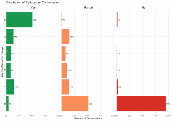 Looking at the results by dimension, ninety percent of the conversations were found to be clear. Across the other dimensions, the ratings were evenly distributed, with 2/3s of conversations rated as being useful, relevant, complete, and accurate.
